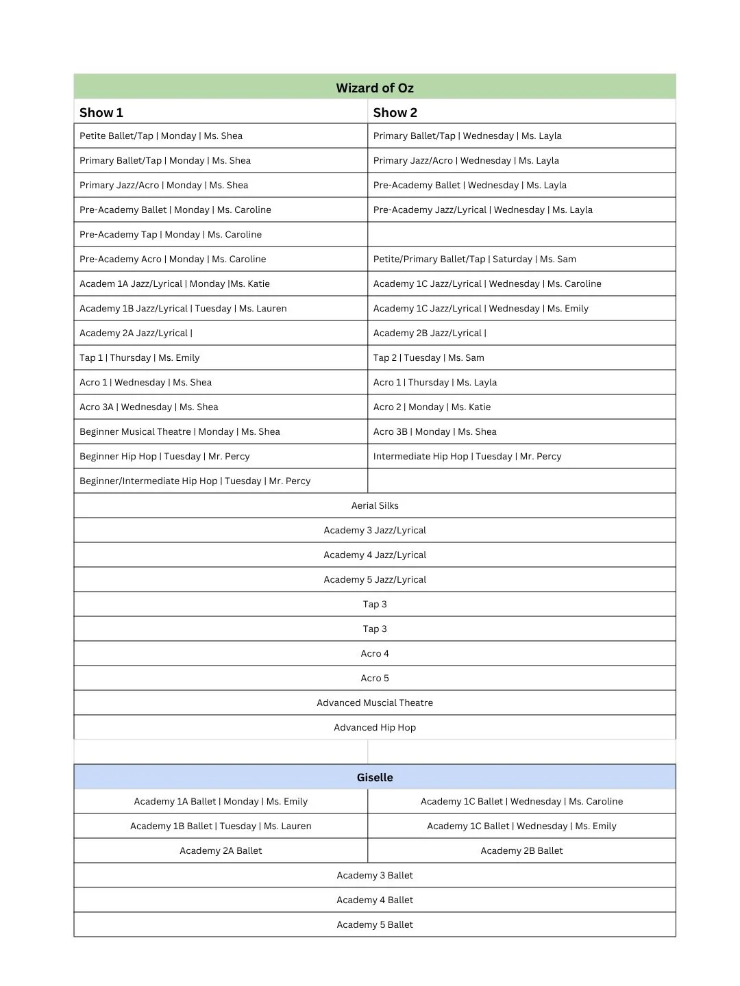 Below is the list of classes and how they are divided between the two performances: